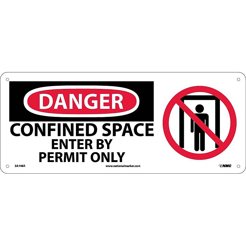 Emphasize your safety message with the addition of an appropriate graphic. Rigid Plastic. 7"x17". Complies With All Safety Regulations. National Marker "Danger Confined Space Enter By Permit Only " Safety sign with graphic measures 7" x 17" and is made rigid plastic material for added durability.