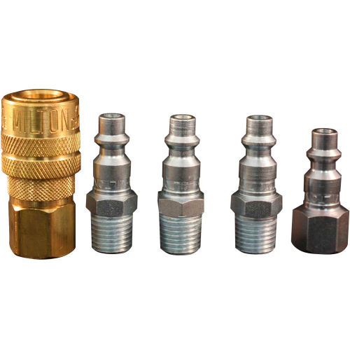 This essential pneumatic tool is ideal for any vehicle trunk, home garage, or automotive shop. Dual head chuck inflator gauge is made of heavy duty construction which provides for long life, even under extreme use and conditions. Equipped with magnifying lens for full view of scale. Milton Industries specializes in tire inflator gauges and this original S-506 dual chuck inflator gauge was the first gauge of its kind ever built in the industry. Milton (S-211) 1/4" NPT M-Style Coupler and Plug Kit (5-Piece) This five piece style coupler kit includes various couplers and plugs with a 1/4" basic flow size. Milton's style Kwik Change couplers are made of brass, while the style Kwik Change couplers are made of case-hardened steel and are plated to resist rust. This collection of couplers, plugs will interchange with all manufacturers who comply with the dimensional requirements of military specification MIL-C-4109. style couplers and plugs offer up to 300 PSI and has an air flow of 40 SCFM. KIT INCLUDES One inflator guageOne 1/4" FNPT couplerThree 1/4" MNPT plugsOne 1/4" FNPT plug.