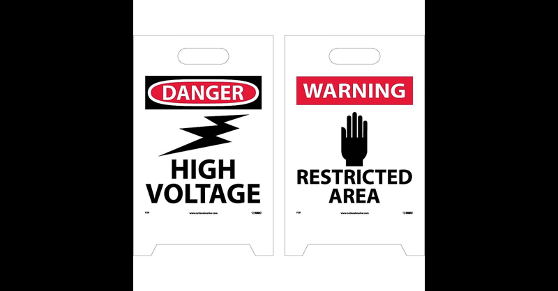 Reversible floor signs with two messages can be reversed when needed. This waterproof sign folds easily for convenient storage. 20 X 12. Corrugated Plastic. Complies With All Safety Regulations. National Marker " Danger High Voltage Warning Restricted Area" Floor sign measures 20" x 12" and is made corrugated plastic material for added durability.