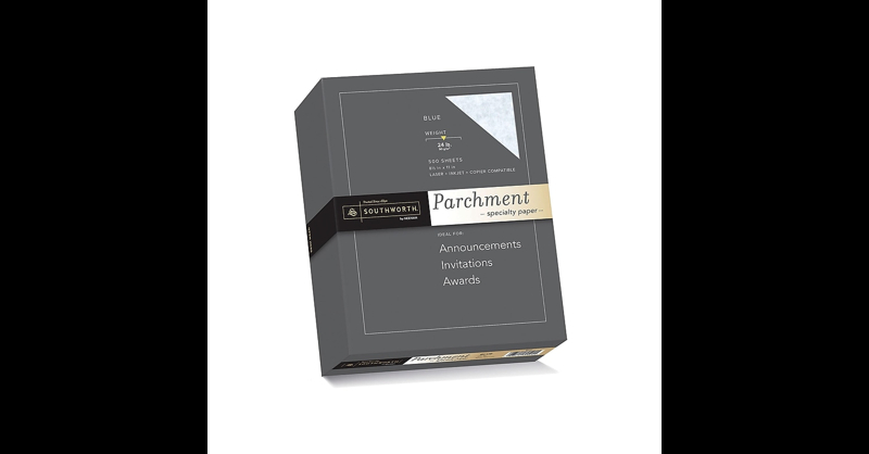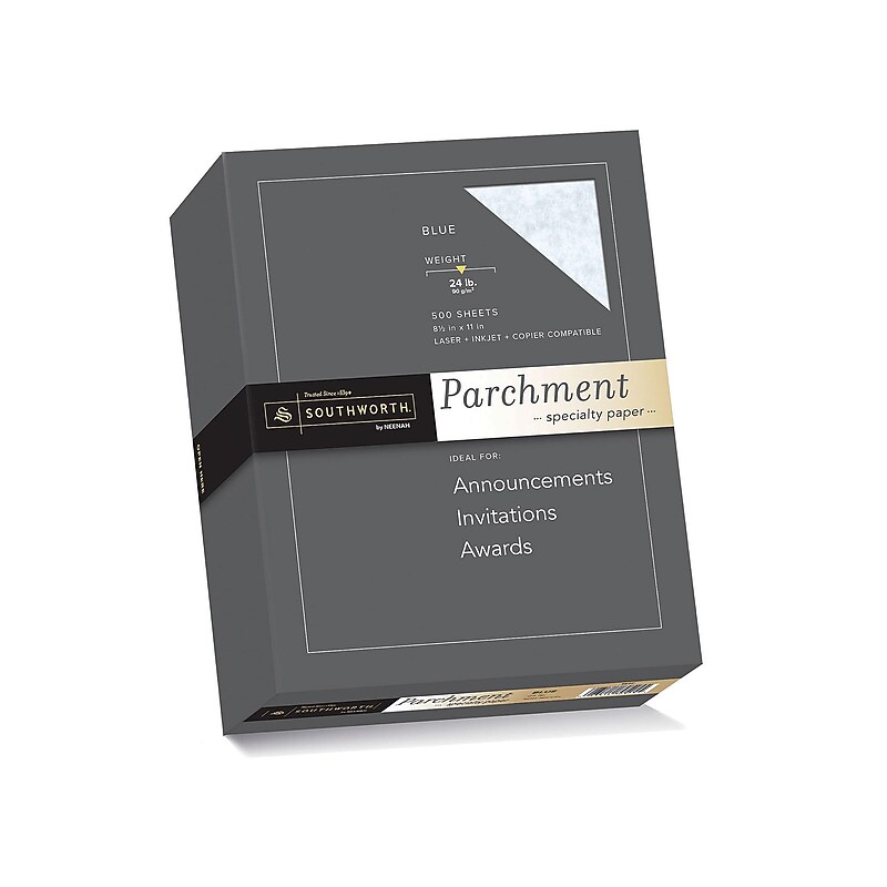 Provide staff members with certificates, give clients invitations, and design other sophisticated documents with this specialty paper. Featuring a 24-pound paper weight, this acid-free paper offers a durable, high-quality look and feel, while thecolor adds a unique touch to each printout. This Southworth specialty paper boasts an upscale parchment finish for a sleek, professional appearance. Specialty paper ideal for awards, certificates, invitations, calligraphy, menus, and more. Blue paper with parchment finish. Paper weight: lbs. Paper size: 8. 5"W x 11"L. Each box contains 500 sheets. Printer compatibility: laser, inkjet, copier. Acid- and lignin-free. Please note that packaging may vary. Design professional awards, menus, and other documents with this Southworth 8. 5 x 11-inch 24-poundparchment-finish specialty paper.