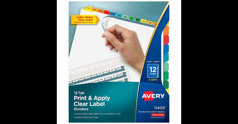 Easily create print shop quality personalized binder dividers with tabs using Avery Index Maker Clear Label Dividers. Customize the title tabs for your dividers quickly and easily using the free templates on the Avery website and print with your inkjet or laser printer for clean, professional looking results in minutes. This pack comes with 5 sets of 12-tab dividers, and the Easy Apply clear label strips make it simple to apply all 12 labels of each set at once. Just print, align labels against tabs, smooth down labels and peel up strip. The white binder dividers feature an assortment of brightly colored tabs for eye-catching convenience when you're looking for the right section. Each 3-hole punched durable divider also features doubled-sided, reinforced tabs and edges to help resist tearing for long-lasting, everyday use. These 3 ring binder dividers with tabs are a great addition to your medical office supplies, school binders, personal organizers, tax office supplies, presentation reports and more. Print, peel, and press your way to a perfect, precise project. Find binder sections easily with white tabbed dividers featuring brightly colored tabs perfect for color coding and quick referencing. Save time and money by creating your own high-quality custom tab dividers using free templates from the Avery website and printing on your laser or inkjet printer. Label all 12 tab dividers at once with the Index Maker Easy Apply Label strip that results in five perfectly aligned sets of tabs. Get a professional, printed-on look with clear labels that virtually disappear on thedivider tabs. Great for organizing your medical document binder, meeting materials, proposals, tax organizer binder, financial planner and more. Five sets per pack. Subdivide file folders with these Avery Index Maker 12-tab clear-labeldividers.