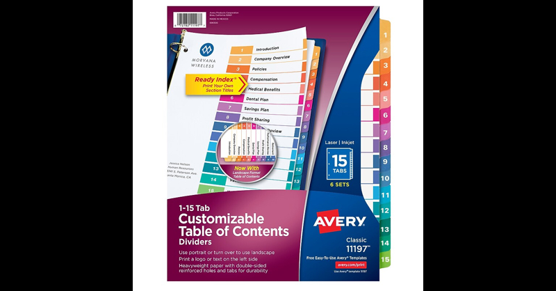 Organize your projects in moments with Avery Ready Index 15-tab dividers. Each tab is preprinted and uniquely color coded for a professional appearance. Print your own custom section titles and images onto the table of contents sheet without worrying about labels or inserts. Whether you're creating planners for classes or hosting a presentation, these dividers are ideal for getting everything sorted. 6 sets of 15 tabbed dividers are included with each sheet measuring 8-1/2"x11". The 3 binder holes are reinforced on both sides of the heavyweight sheet to prevent creasing and tearing. Each divider tab includes additional reinforcement along the edge of each page to distribute stress and resist folding. The printable table of contents is dual compatible with both laser and inkjet printers. This sheet can also be printed in either portrait or landscape so that your projects can be displayed in any orientation. Just flip the sheet to view the other layout on the opposite side. Try out free templates for these dividers and check out the Avery Design & Print software at avery. com/templates. Keep track of your tab dividers quickly and easily with the printable table of contents sheet. Add graphics, logos and titles to the table of contents page with free templates at avery. com/templates. 6 sets of 15 dividers are included with sturdy tab and hole reinforcements on both sides. Reinforcedtabs are preprinted and don't require inserts or labels. Versatile design works in either portrait or landscape orientation and is great for project binders and training manuals. Securely insert the 3 hole-punched paper dividers into your favorite 3 ring binder. The page dividers' table of contents is both inkjet and laser printer compatible. Stay organized and enjoy a professional binder appearance suitable for any work or home office with the uniquely color-coded tabs. Navigate large documents easily with this 6-pack of Avery Ready Index durablepreprinted 15-tab table of contents dividers.