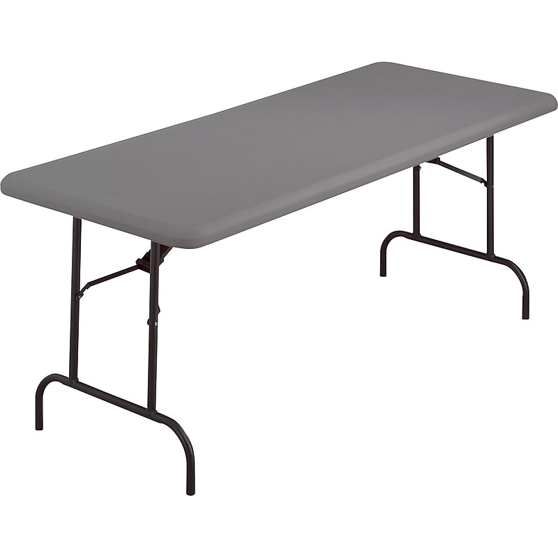 Iceberg 5' Heavy-duty commercial resin folding banquet table finish has 2" thick blow molded high impact polyethylene scratch/stain resistant top. Table measures 29" x x 60" and holds up to 1200 lbs weight capacity. 29"H x 60"W x 30"D. Holds 1,200 lbs. evenly distributed. Folds flat for easy storage. Economy version of the popular original IndestrucTable. Lightweight and durable. Contemporary-shaped, blow-molded, high-density polyethylene top resists scratches and dents. Heavy-duty, 1" round, powder-coated steel legs. Legs fold into protective underside cavity. Please contact your Account Manager for large quantity orders of 50 or more tables. The ultimate in function and durabilityideal for offices, schools, banquets or any temporary work environment. Designed for commercial/heavy-duty environments, yet lightweight and portable. Washable and easy to clean. Scratch- and dent-resistant tops constructed of resistant blow-molded high-density polyethylene for durability. Frames and legs feature grey powder-coated steel tubing. Legs fold into protective underside cavities and "nest" for safe and easy storage and transport; no-mar plastic feet. Holds 1200 lbs. evenly-distributed weight. 29" height. Manufacturers 5-year limited warranty. Iceberg 5' Heavy-duty commercial resin folding banquet table finish measuring 29" x x 60" holds up to 1200 lbs weight capacity.
