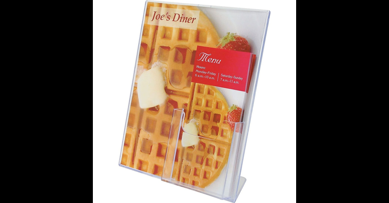 This slanted sign is made of durableplastic and is sealed on three sides to keep your literature firmly in place. It features polished edges for a professional look. Front of holder features a convenient 4" wide brochure/leaflet pocket. Clear durable plastic construction. Literature slides in from the top. Slanted holders feature an easy removal slot that allows you to simply switch out signs and ads in a rush. Handy 4" pocket allows you to display leaflet size literature as well. This Staples slanted sign with leaflet holder measures x 8 1/2" and has polished edges to provide a high-quality look.