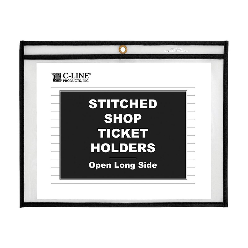 Store and maintain work orders, inventory cards, or other documents with thesejob/shop ticket holders. The strong, rigidvinyl lets you read pages and shields contents from dirt or moisture, and the reinforced stitched edge adds durability for long-term use. These C-Line job/shop ticket holders open along the side to remove or insert pages quickly. Job ticket holder is ideal for storing documents, files, and presentation papers. Clear vinyl material provides easy viewing. Dimensions: 11"L 8. 5"W. They are sold as 25 per pack. Protect paperwork or schedules with this 25-count box of C-Line reinforced-edge 11 8. 5-inch insertjob/shop ticket holders.