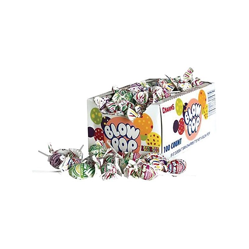Offer a tasty sucker to customers, employees, and other guests with these Blow Pops. With 100 to a box, these candies make replenishing your supply quick and easy, while the assorted flavors allow consumers to pick out their favorite. These Charms Blow Pops are a two-in-one delight, with a hard candy shell and a sweet, chewy gum in the center to provide variety. Lollipops are a perfect addition to any dessert table. Everyday theme. The product is kosher, gluten-free, nut-free. oz. package. 100 per box. Variety flavors. Individually wrapped candies make it easy to share them. Fill up the candy bowl with this box of 100 Charms Blow Pops.
