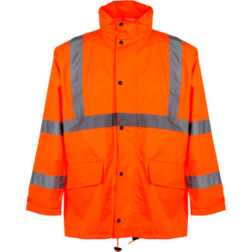 Features: Jacket: 150D Oxford with PU Coating Waterproof with Sealed Seams Zipper with Snap Front 2" Silver Reflective Tape2 Lower Front Pockets with Flaps6002 - Orange Jacket Certification: ANSI/ISEA 107-2010 Class 3 6802- Orange Rain Pants sold separately.