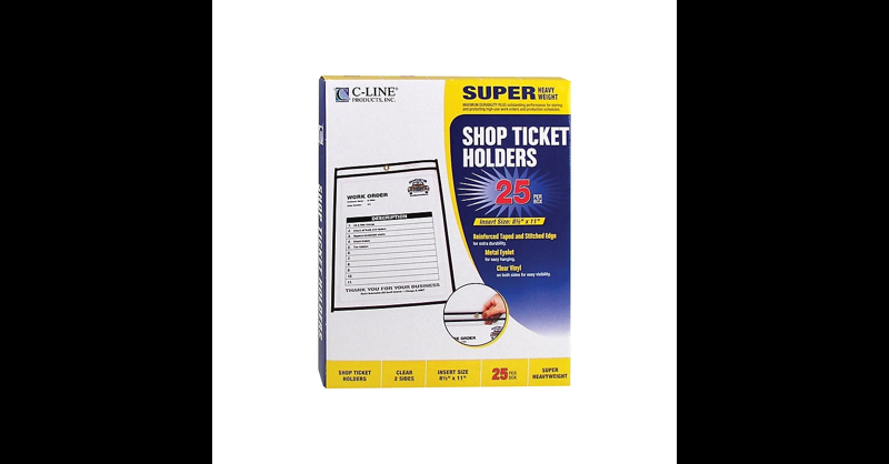 Give your repair staff an easy way to read work orders and repair requests with these C-Line job/shop ticket holders. The reinforced stitched edges stand up to frequent handling, while durable clear vinyl construction protects paperwork from spills, splashes, and stains. Each of these C-Line job/shop ticket holders features a metal eyelet, making it easy to attach work orders directly to products using string, wire, or plastic ties. Job ticket holder is ideal for storing documents, files, and presentation papers. Clear vinyl material provides easy viewing. They are sold as 25 per box. Keep work orders attached to products or parts with these C-Line 8. 5 11-inch stitched job/shop ticket holders.