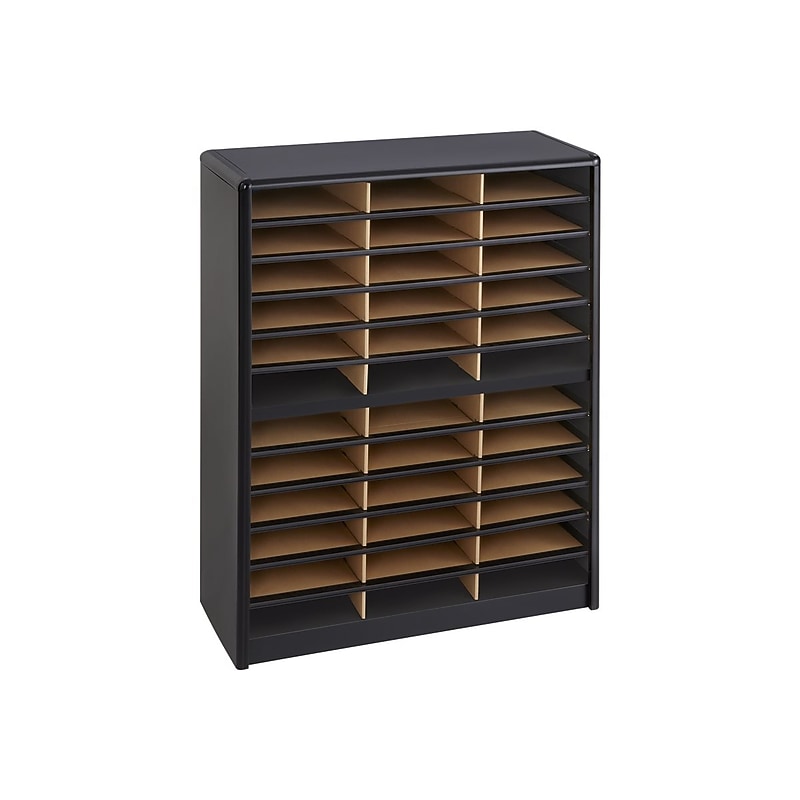 Create an office mail system or keep copy paper sorted with this literature organizer. Each of the 36 compartments hold up to 550 sheets of letter size pages, and the flat fronts provide space for content labels. This Safco Value Sorter organizer features a steel shell and corrugated fiberboard backing for added durability. Literature sorter and organizer with 36 oversized slots perfect for storing papers. Overall dimensions: 38"H 32. 25"W 13. 5"D. Steel shell with heavy-duty support shelves made of corrugated fiberboard colored Compartment dimensions: 2. 5"H 9. 75"W 12. 5"D, load capacity of each is 5 lbs. Oversized compartments hold up to 550 sheets of letter-size paper. Solid fiberboard back ensures stability and durability. Shelf fronts have built-in label holders (labels included). Assembly required. Metal shelving connector and kit patent No. 5944439. Shipping dimensions and weight: 7. 5"H 18. 25"W 40. 25"D, 37. 2 lbs. Limited lifetime warranty. ⚠ WARNING: This product can expose you to chemicals including Lead, which is known to the State of California to cause cancer or birth defects or other reproductive harm. For more information go to www. P65Warnings. ca. gov/furniture. Keep paperwork or office mail neatly arranged with this Safco Value Sorter black steel 36 compartment literature organizer.