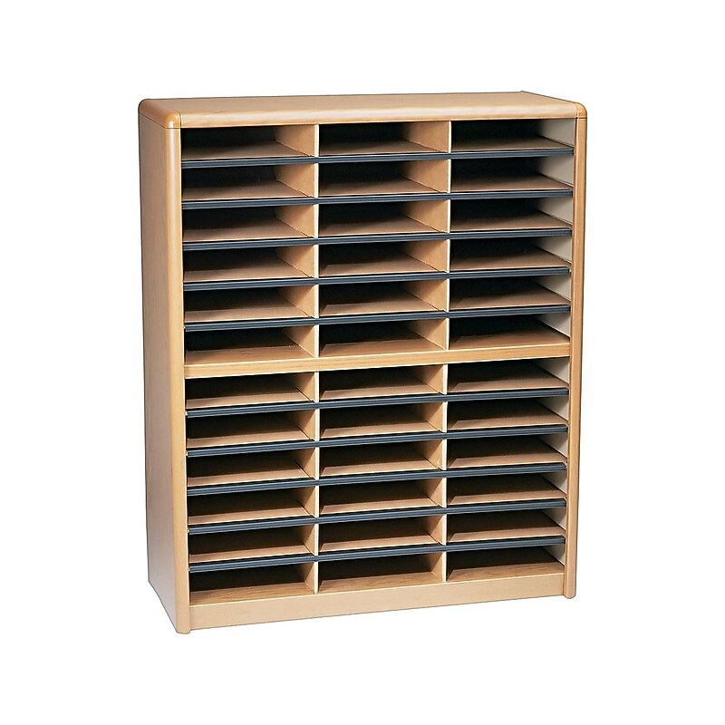 Reduce paperwork clutter with this literature organizer. Built-in label holders on each shelf front make it easy to assign categories to the 36 compartments, and the wood-grain finish offers a professional look. This Safco Value Sorter literature organizer features a steel shell and corrugated fiberboard construction for added durability. Literature sorter and organizer with 36 oversized slots perfect for storing papers. Overall dimensions: 38"H x 32. 25"W x 13. 5"D, product weight: 34 lbs. Steel shell with heavy-duty support shelves made of corrugated fiberboard, with wood grain finish. Compartment dimensions: 2. 5"H x 9. 75"W x 12. 5"D, load capacity of each is 5 lbs. Oversized compartments hold up to 550 sheets of letter-size paper. Solid fiberboard back ensures stability and durability. Shelf fronts have built-in label holders (labels included). Assembly required. Metal shelving connector and kit patent No. 5944439. Shipping dimensions and weight: 7. 5"H x 18. 25"W x 40. 25"D, 37. 2 lbs. Lifetime manufacturer limited warranty. ⚠ WARNING: This product can expose you to chemicals including Bisphenol A (BPA), which is known to the State of California to cause cancer or birth defects or other reproductive harm. For more information go to www. P65Warnings. ca. gov/furniture. Arrange copy paper, office mail and other documents in this Safco Value Sorter 36 compartment literature organizer.