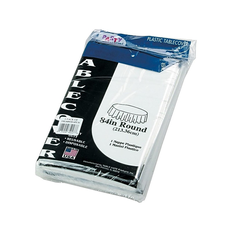 Create a neutral background for place settings and centerpieces with these table covers. Thecolor coordinates with a wide range of party decorations, while the plastic construction resists spills, rips, and tears for a neat, clean look. Each of these Tablematetable covers is easy to fold up and remove after your events have ended, allowing for quick, simple cleanup. Reusable and disposable round table cover to protect table top from spills. Made of heavy-duty plastic in solidcolor. Dimensions: 84"Dia. Comes in a pack of six. Prep dining areas for special events with these Tablemateplastic table covers.