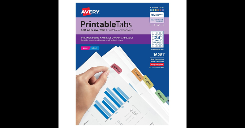 Get into a sticky situation you won't want to get out of with Avery Printable Self-Adhesive Tabs. Quickly and easily create custom binder dividers with tabs to quickly and easily organize bound reports, reference manuals, personal organizers and more. Use the free templates and designs available on the Avery site to format the divider tabs for printing on your laser or inkjet printer, or personalize them by hand by writing on them directly with a pencil, pen, marker or highlighter. The self-adhesive plastic divider tabs are repositionable when applied, allowing for a bit of experimentation to find just the right spot. Over time, the adhesive becomes permanent, proving these tabs will stick by you for the long term. Great for personal organization projects at home, work or school, these self-adhesive tabs work great with tabbed dividers and file folders to keep your reports, records, photos and important documents in order. Create your own dividers for 3 ring binders easily by attaching these durable plastic tabs to the edge of any size page. Ideal for use with binder dividers, bound reports, personal organizers, reference manuals, catalogs or more. Easily reposition tabs for page dividers with the special self-adhesive that becomes permanent over time for added security. Write directly on the front and back of tab dividers or print text with your laser or inkjet printer. Easily customize tabs for 3 ring binder dividers, notebooks, folders and more using free templates on the Avery site. Create a searchable organization system for binders or bound booklets with these Averycolor plastic self-adhesive printable index tabs.