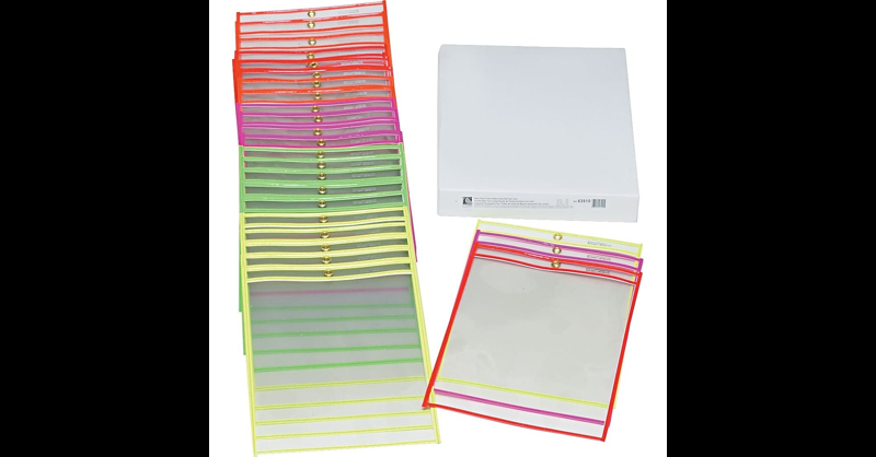 Neon stitched, super heavyweight shop ticket holders let you color code important paperwork and make special jobs stand out. Sturdy,vinyl construction allows for easy visibility of documents and stitched seams ensure long-lasting utility. These easy-to-identify shop ticket holders have a metal eyelet on the top for hanging. Clear front and back with neon-colored stitching. Reinforced Edges Shop Ticket Holders withfront and back. Top loading - closed on three sides. Hang holders at work site. Vital information stays clean, visible and at hand, lifts out easily. Perfect for a variety of uses in manufacturing, inventory control or any environment where paperwork must be posted. Taped and stitched for long wear. Metal eyelet for hanging. 25 holders per box. Neon color stitching. Five each: red, yellow, orange, green and pink. 9 12 insert size. Works great for organizing work by department, day-of-the-week or importance.