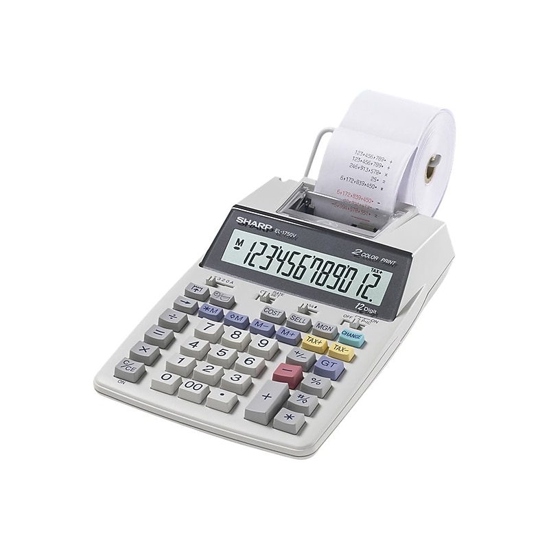 Increase calculation speed with this printing calculator. A 12-digit LCD allows for the use of large numbers, while two-color printing makes it easy to tell the difference between positive and negative values. Built-in calendar and clock functionality displays the time and date at a glance. A professional keyboard layout lets you enter numbers quickly for increased efficiency. Cost, sell, and margin keys make determining profit margins simple, while four-key memory delivers the ability to save commonly used numbers for faster input. A built-in grand total key makes it possible to add the results of multiple calculations at the push of a button. This Sharp printing calculator is both battery and AC-powered for added flexibility. Printing calculator offers 12-digit LCD display for convenient viewing. Prints up to two lines per second for quick, clear documentation. Dimensions: 2. 03"H x 5. 91"W x 9. 06"D. Powered by AC adapter or four AA batteries. 4-key memory keeps often-used figures accessible for faster calculations. Package content: AC adapter. Streamline financial calculations with tax calculation, cost, sell, margin, mark-up, and item counter functions. Decimal switch, rounding switch, percent, sign change, constant calculation, double zero, grand total, and more functions help you solve a variety of mathematical problems. Prints positive numbers in black and negative numbers in red, eliminating misreads. Angled display is easy on the eyes. Comes 6-month manufacturer limited warranty. Safety Data Sheet WARNING: In California, special handling may apply; product contains Perchlorate Material. See https://www. dtsc. ca. gov/hazardouswaste/perchorate. Perform quick calculations with this 12-digit Sharp printing calculator.