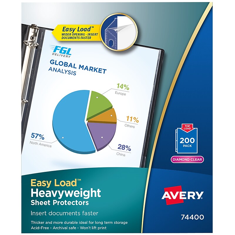 Prevent potential damage to critical documents, school assignments, or client proposals with these Avery presentation sheet protectors. The wide tops make it easy to slide paper inside, and the heavy-weight construction offers protection against folding and tearing. This package contains 200 protectors, providing an ample supply for students or busy offices. Featuring acid-free, archival-safe construction, these Avery presentation sheet protectors are ideal for long-term filing. Heavy-weight sheet protectors keep safe your papers, ensuring them to last as long as you need.polypropylene construction delivers a crisp view of your pages as well as durable protection. Stores and protects 8. 5" papers. Three-hole-punched and ready for use. 200 sheet protectors per set. Each sheet protector holds one sheet of paper. Easy Load feature provides a wider top opening so papers slide easily into place. The acid-free and archival-safe material ensures your pages stay in top condition and that print remains on your papers, rather than transferring to the sheet protector. Give client proposals or school reports a finished look with these Avery heavy-weight presentation sheet protectors.
