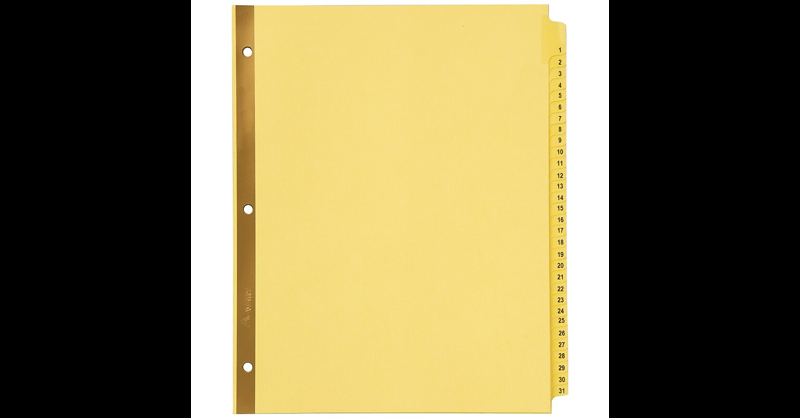 More efficient organization for alphabetical, chronological or numerical sorting. The process becomes simple with handy preprinted tabs to help you get started organizing your paperwork instantly. Gold binding edge is reinforced so you can turn pages secure in the knowledge that your dividers won't tear easily from the binder rings. Easy-to-read black lettering helps you find the right section at a glance. Tab Style: 31-Tab; Tab Color(s): Buff; Index Divider Size: 11 x 8 1/2; Form Quantity: 1. Dividers feature 31 tabs labeled numerically from 1 to 31. Laminated tabs feature bold black printing on front and back for maximum readability. Reinforced strip adds durability so holes don't tear. Three-hole punched and ready for immediate use. Organize paperwork and other documents with this set of Avery 31-tab buff-paper preprinted laminated tab dividers.