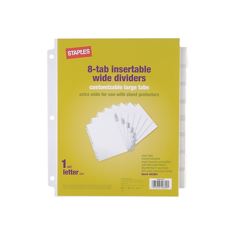 Keep your file folders organized with these Staples extra-wide eight-tab dividers. The reinforced tabs provide durability, while copper-reinforced holes prevent the tab dividers from tearing out of the binder. These tabs are clear so no matter what labels you insert, your dividers have a clean, professional look. These Staples extra-wide eight-tab dividers make it easy to organize oversize documents by individual categories or dates. Tab dividers let you organize projects, personal documents, and more. Made ofpaper with clear tabs. Dimensions: 8. 5"W x 11"L. Eight-tab set of three-hole punched dividers. Made from 20% post-consumer recycled material. Eight inserts are included, insert layouts compatible with Microsoft Word, WordPerfect, and more. Product Instructions . Create custom professional folders with these Staples extra-wide eight-tab clear dividers.
