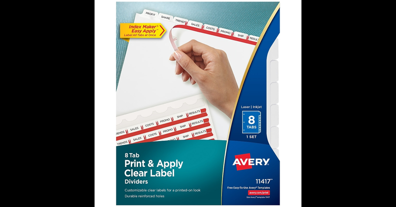 Easily create print shop quality personalized binder dividers with tabs with Avery Index Maker Clear Label Dividers. You can customize the title tabs for your dividers quickly and easily using the free templates and designs on the Avery website and print them yourself. Label sheets are optimized for inkjet and laser printers for clean, professional looking results in minutes. This pack comes with one set of 8 tab dividers, and the Easy Apply clear label strips make it simple to apply all 8 labels at once. Just print, align labels against tabs, smooth down labels and peel up strip. Each 3-hole punched durable divider also features doubled-sided, reinforced tabs and edges to help resist tearing for long-lasting, everyday use. These 3 ring binder dividers with tabs are a great addition to your medical office supplies, school binders, personal organizers, tax office supplies, presentation reports and more. Print, peel, and press your way to a perfect, precise project. Save time and money by creating your own high-quality custom tab dividers using free templates from the Avery website and printing on your laser or inkjet printer. Label all 8 tab dividers at once with the Index Maker Easy Apply Label strip that results in one perfectly aligned set of tabs. Get a professional, printed-on look with clear labels that virtually disappear on thedivider tabs. Great for organizing your medical document binder, meeting materials, proposals, tax organizer binder, financial planner and more. Long-lasting, tear-resistant tabbed dividers feature doubled-sided reinforced tabs and edges. Create custom, professional folders with these Avery Index Maker eight-tabclear-label dividers.