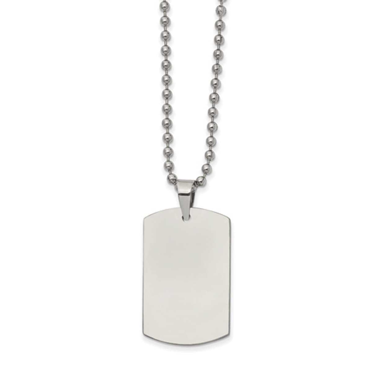 This Mens Gentlemen's Classics(tm) stainless steel dog tag is striking and reversible. Its design can be personalized and engraved, is highly polished, and hangs from a long ball chain that is secured with a fancy lobster clasp for closure. Chain length: 22" Pendant size: 41mm x 20mm.