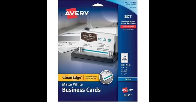 Make a lasting impression on important clients, associates and prospective customers with Avery 08871 Clean Edge Business Cards. This pack of 200 first-rate customizable business cards is made from quality cardstock with a weight of 93lbs / 254gsm, and offers an impressively substantial look and feel. If you need professional quality business cards, customer loyalty cards, appointment reminder cards or more, these x 3. 5" cards are an exceptional way to stand out from the crowd. Thesebusiness cards have innovative Clean Edge technology for quick and easy separation, giving you the cleanest, smoothest edges of any business card on the market. Proprietary Avery Sure Feed technology helps deliver a more reliable feed through your inkjet printer in order to minimize print misalignments and paper jams. Whether you have your own design or you're creating one from scratch, take your brand or business to the next level with Avery Design & Print Online, which makes it easy to create and print double-sided customized cards from your own home or business. The free browser-based software has everything you need to design business thank you cards, personalized gift tags, reward cards, price tags and more. Try it out today on the Avery website. Easily customize your own business cards, loyalty cards for business, RSVP cards and more using Avery Design & Print Online and the hundreds of available templates and designs. Enjoy premium quality custom business cards featuring Clean Edge technology that allows cards to be snapped apart easily, leaving behind clean, smooth edges. Each sheet of business card paper features proprietary Avery Sure Feed technology for a more reliable feed through your printer to help reduce misalignments and jams. Print beautiful, double-sided designs onprintable cardstock paper with a weight of 93 lbs / 254 gsm. Perfect for DIY business cards, rewards cards, personalized gift tags, appointment cards and more. Item includes 20 printable sheets with a total of 200 blank x 3. 5" cards. Printable cardstock sheets are optimized for inkjet printers. Print professional business cards with these Avery Clean Edge two-side printable inkjet business cards.