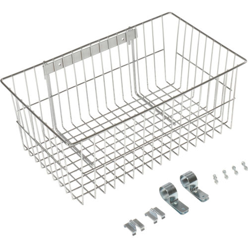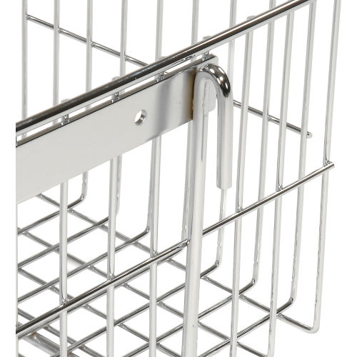 Provides additional storage or display for your wire shelving unit or Wall Wire Grid Panel. Heavy duty welded wire construction makes this an extremely durable basket to use for all types of products. Chrome over nickel electro plating creates a brilliant high gloss finish. Easy assembly. Limited One Year Warranty in dry application and usage. NSF approved dry use.