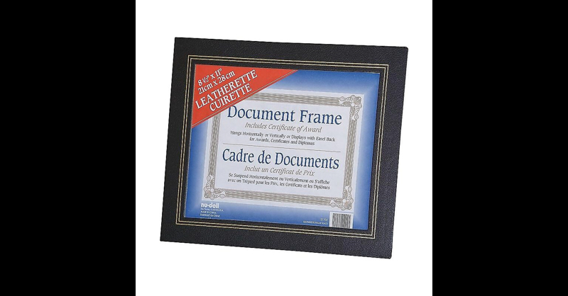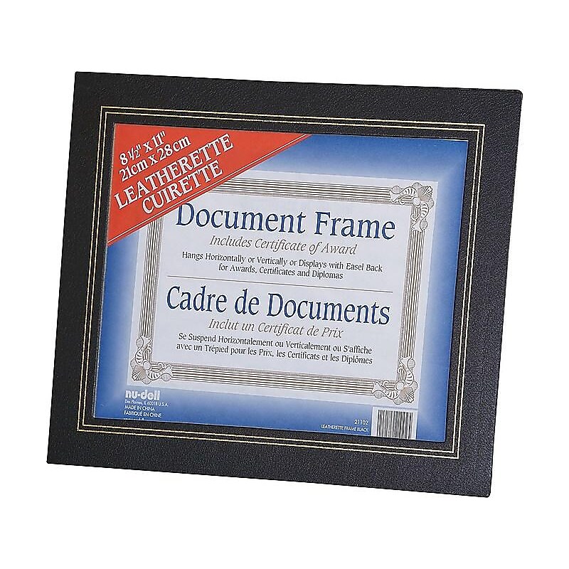 Display important documents or awards inside this frame that is made of simulated leather grain with gold foil inlay for a nice display in any home or office setting. This NuDell frame measures 8. 5 x 11 inches with matting and comes with an easel support to display on a desk, table or counter. This frame can be used to display important awards, prestigious certificates, and more. Can be placed on a tabletop or mounted on a wall for easy viewing. Horizontal or vertical document frame to showcase your favorite photographs. Certificate frame features a buffalo leather finish. Each holds one document or certificate. Certificate size: 8. 5"W x 11"L. Includes two frames per pack. Easel-back design allows frames to hang or stand horizontally or vertically. 10-3/4x13" frame size holds 8-1/2x11" documents. Includes clear protective acetate cover. 2 holders per pack. Show off certificates in this NuDell leatherette black frame.