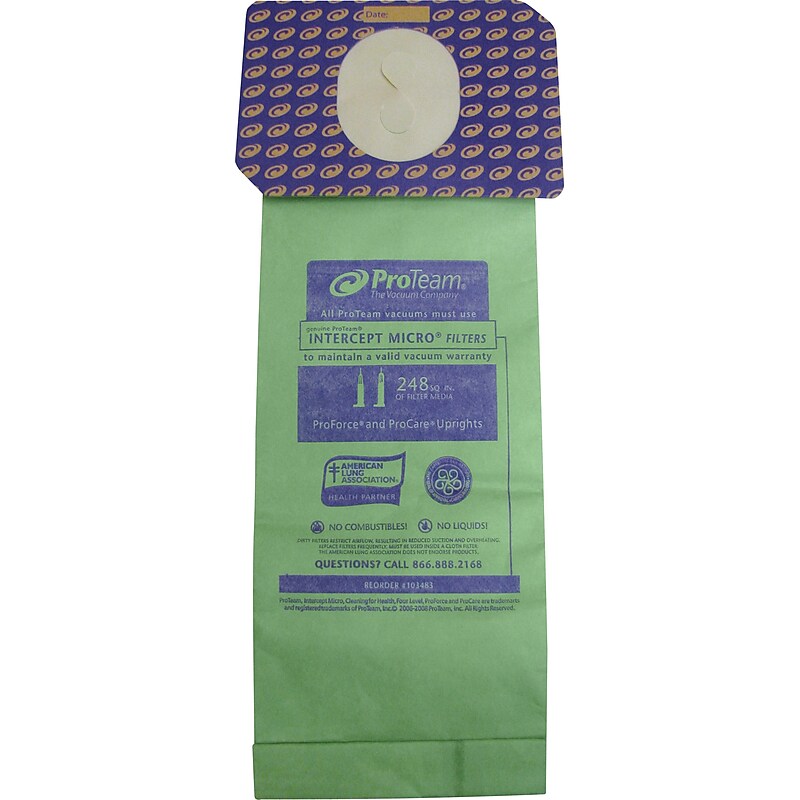 Assist your vacuum cleaner suction off spores, pollens and other microscopic particles efficiently with the "ProTeam 103483 Intercept Micro Vacuum Filter, 3. 25 qt. " This disposable vacuum filter is treated with antimicrobial organic agents and has a double-pleated design that increases the filtration area by 21%. Its thick disposable material makes these vacuum filters difficult to shred. These filters are compatible with PreForce Vac. The pack contains 10 micro filter bags. organic agents and feature a double-pleated design that increases the filtration area by 21%, enabling thorough cleaning. It has 10 bags per pack and is compatible with the PreForce Vac. Product Type: Intercept Micro Vacuum Filter. Capacity: 3. 25 qt. Fits: ProForce Vacuums. Four Level Filtration - ProTeam Four Level Filtration system provides advanced protection against there introduction of pollutants back into an environment. Larger Capacity - ProTeam Intercept MicroFilters have 21% more filtration area than non-pleated filters. Improved Air Quality - Dual layered construction captures fine particles, improving Indoor Air Quality. Intercept microbial treatment helps contain odors and prevent the growth of mold and bacteria. Packaging: 10/pack. Clean pollen, bacteria and other microscopic particles from your indoors easily with "ProTeam 103483 Intercept Micro Vacuum Filter, 3. 25 qt. ".