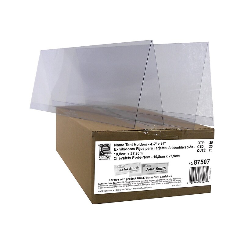 Make name-tents and signs on an inkjet or laser printer with these tent holders. Theplastic construction makes the inserted tent cards look high-end, while the free-standing design allows placement on most flat surfaces. These C-Line plastic tent holders hold large 4. 25 11-inch cards, ideal for making larger display cards stand out. Desktop sign holder lets you conveniently display signage to ensure maximum visibility. Clear plastic offers durability and better visibility. Side loading design for easy insertion of printed material. Dimensions: 4. 25"H 11"W. Designed to hold display sign that measures 11"W 4. 5"H. 25 per box. Create professional-looking table displays with these C-Line rigid 4. 25 11-inch heavyweight plastic tent holders.