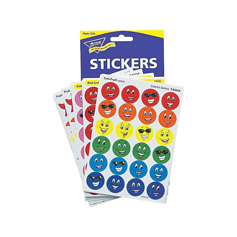 Give out fun incentives, collectibles, and rewards with this variety pack of stickers. This pack of stickers includes 648 0. 75-inch scratch-and-sniff stickers shaped like smiles and stars. All of the stickers in this Trend Stinky Stickers jumbo variety pack are non-toxic, acid-free, and safe for photos. Stinky Stickers are fun to collect or use to motivate and reward. Come in six red, yellow, purple, orange, green, and blue with four different scents. Designs include colorful smiles and star smiles. Variety pack includes 648 stickers. Stickers are acid-free, non-toxic, and safe for photos. Assortment may vary. Bring on the smiles with this Trend Stinky Stickers scented smiles and stars jumbo variety pack.