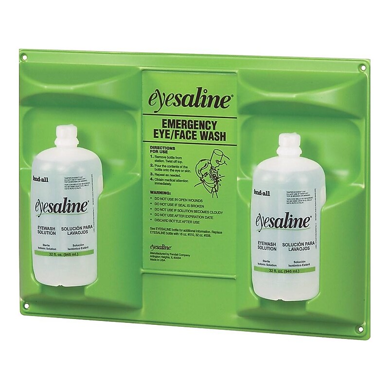 Outfit laboratories, warehouses and a host of other venues with this personal eyewash wall station. With two bottles included, this Fendall Eyesaline eyewash station ensures that emergencies involving multiple people are manageable. Double eyewash wall station for immediate flushing. Bottles capacity is oz. Sealed, sterile bottles contain a buffered saline solution - superior to tap water for eye care. Provide immediate flushing of the eye until the injured person can be helped to a primary emergency eyewash device, highly visible and readily available for emergency flushing and decontamination. Each system is designed for easy snap-out access to eyewash flush bottles, wall stations mount easily with provided fasteners. Integral overhang protects bottles from dust and debris to minimize maintenance requirements, durable plastic is easy to clean. Extended flow opening provides longer flow rate than conventional bottles. Ensured quality and lasting value with FDA grade polyethylene bottles featuring lot numbers and expiration dates. 1-year manufacturer limited warranty. Safety Data Sheet . Be prepared to flush out debris and chemicals from eyes with this Fendall Sperian Eyesaline 32-ounce personal eyewash double-bottle wall station.