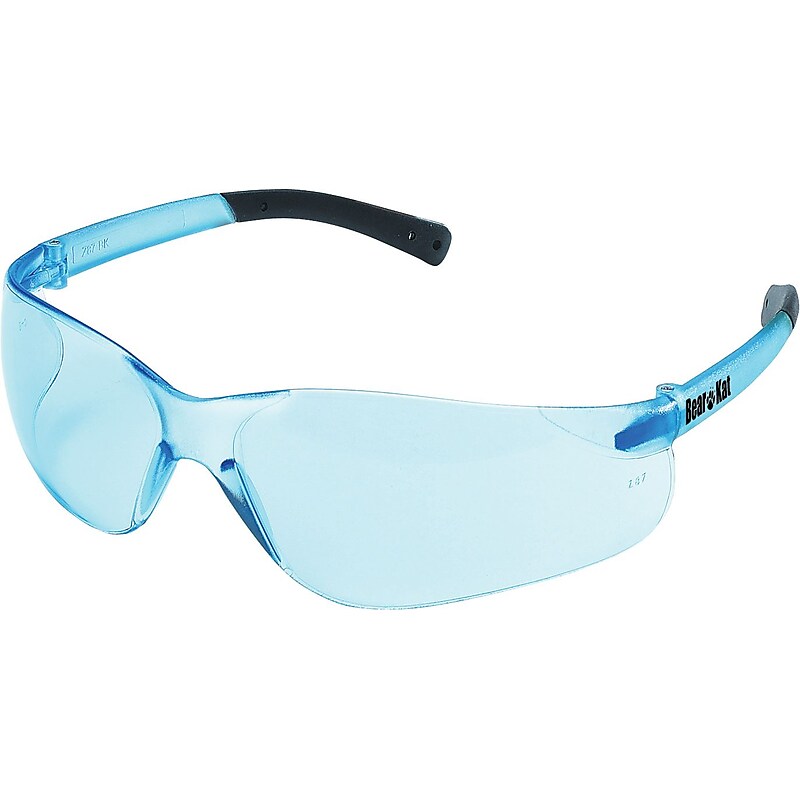 Lens material: Polycarbonate. 99. 9% UV protection. Flexible temple design. Single lens wrap-around protection. Meets ANSI Z87+ (high impact) and certified to the requirements of CSA Z94. 3 standards. MCR Safety BearKat Crews ANSI Z87 Safety glasses in frostcolor feature flexible temple design and non-slip rubber head grips that provide excellent comfort/safety.