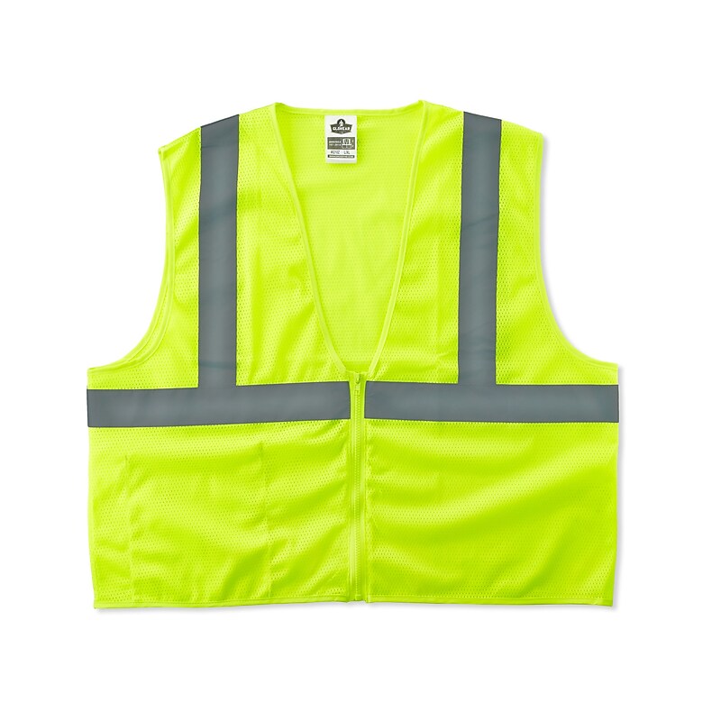Ergodyne GloWear Class 2 Economy vest color features water resistant polyester mesh with 2" Level-2 reflective tape for safe use. Vest comes in L/XL size and includes one inside pocket, zipper closure for user convenience. Economy Vest. Certifications and Standards: ANSI/ISEA 107-2015 Class 2, Type R compliant. Zipper. Lime. L/XL. 1 each. ANSI-compliant polyester mesh. One inside pocket. 2" Level 2 ANSI-compliant tape. Road construction, utility crew, survey crew, construction, railway workers, baggage handlers, emergency response, warehousing/distribution applications. Size L/XL. Zipper closure. Protective clothing safeguards you and your employees from hazardous situations.