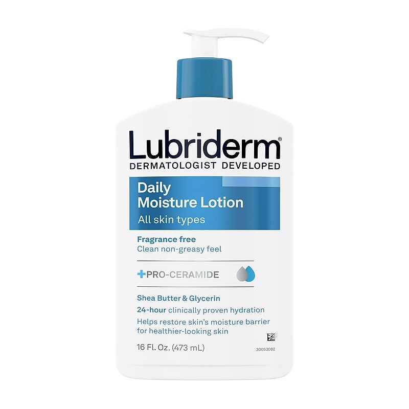 Get healthy-looking skin with this unscented hydrating body lotion, clinically shown to help moisturize skin for 24 hours. With Pro-Vitamin B5, this non-greasy lotion leaves skin soft, clean & smooth. 16-fluid ounce bottle with pump of Lubriderm Daily Moisture Fragrance-Free Lotion is our solution to replenish and moisturize dry skin that's suitable for the whole family. Clinically proven to moisturize normal-to-dry skin for 24 hours, the fragrance-free lotion is enriched with Pro-Vitamin B5 and skin essential moisturizers found naturally in healthy skin to help improve your skin's moisture barrier. Achieve healthy-looking skin with the use of the fragrance-free and non-greasy formula of this daily body lotion which leaves a pleasant, soft, clean and smooth feel to the skin. The fast-absorbing, fragrance-free formula of this body lotion helps keep tattooed skin looking its best. Plus, this dermatologist-developed brand is the #1 recommended brand by tattoo artists for tattoo care and aftercare. For external use only, smooth this daily lotion intended for normal-to-dry skincare on hands and body for everyday moisture and hydration. Essential for a fully stocked breakroom or supply closet. Packaging my vary. Safety Data Sheet . Transform dry skin into healthy-looking, more resilient skin.