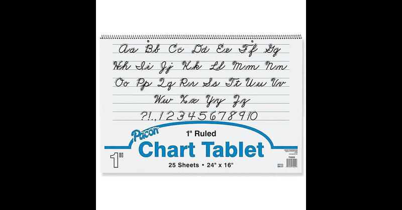 Help students work on their cursive writing skills with this chart tablet. The spiral binding allows for quick page turning, while the printed cursive alphabet makes it easy to refer back to letters. Featuring a two-hole-punched design, this tablet can be hung up easily, ensuring high visibility for the entire class. This Pacon flip chart tablet is made with high-quality sulphite bond paper for enhanced durability and strength. Flip chart tablet works great for classroom anchor charts. Contains 25 two-hole punched white sheets that are 1" ruled on both sides and spiral bound to stiff covers. Dimensions: 16"H x 24"W. Designed to assist in classroom demonstration of cursive style; elementary school grade. Made of sulphite bond paper. Works great for anchor charts that can be used to help reinforce lessons being taught and also serve as a reference tool to help children with problem solving. Recyclable. Improve your penmanship with this Pacon 25-sheet flip chart tablet.