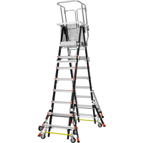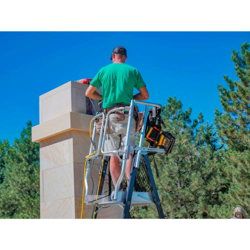 Industry regulations require ladder users working above a certain height to tie off to a suitable anchor point before they can work with both hands. In some circumstances, these standards are often difficult or even impossible to keep, and often result in operators working in unsafe positions. We engineered the Little Giant Cage adjustable enclosed platform to be a versatile, safe alternative to tying off. The Cage is constructed of nonconductive, high-strength fiberglass-resin composite. The Cage is fully adjustable in one-foot increments, allowing the operator to adjust the platform height to the job at hand. Each side adjusts independently, so operators can also use the Cage over uneven surfaces or stairs, where a mechanical lift or ordinary stepladder could never go. And the Cage protects operators in a fully enclosed working platform, allowing them to work safely and quickly with two hands while complying with industry regulations. Time- and energy-saving Tip & Glide Wheels make it quick and easy to move from job to job. The Cage is also available with optional Wheel Lift Casters that allow you to easily move the Cage from place to place while fully deployed. Complies with all applicable OSHA requirements and ANSI 14.5 standards.