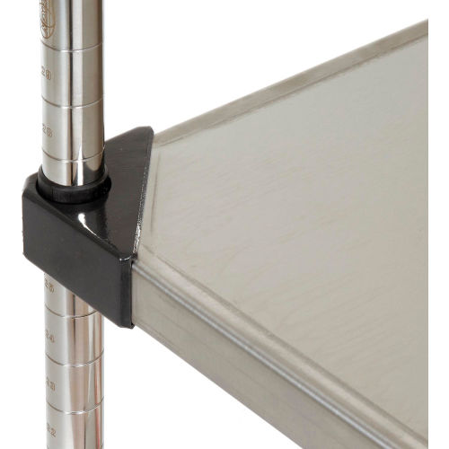 Nexel Stainless Steel Solid Shelving Add-On 48"W x 18"D x 63"H Add-On shelving units allow unit expansion to make the most of storage space. Includes 2 posts with leveling feet, 4 shelves, snap-on sleeves and S-hooks to join units. Solid Stainless Steel shelves feature a dual layer construction that provides strength and rigidity and is temperature and moisture resistant. Solid shelves allow for display storage of small equipment and instruments. Features: 304 Stainless Steel Raised lip surrounding the edge of each shelf to prevent spills from overflowing Open styling to allow shelves to be reached from all sides Includes 4 shelves, 2 posts, snap-on sleeves and S-hooks to join units Shelves easily adjust without tools at 1" increments NSF approved for wet or dry useLimited lifetime warranty against rust and corrosion.