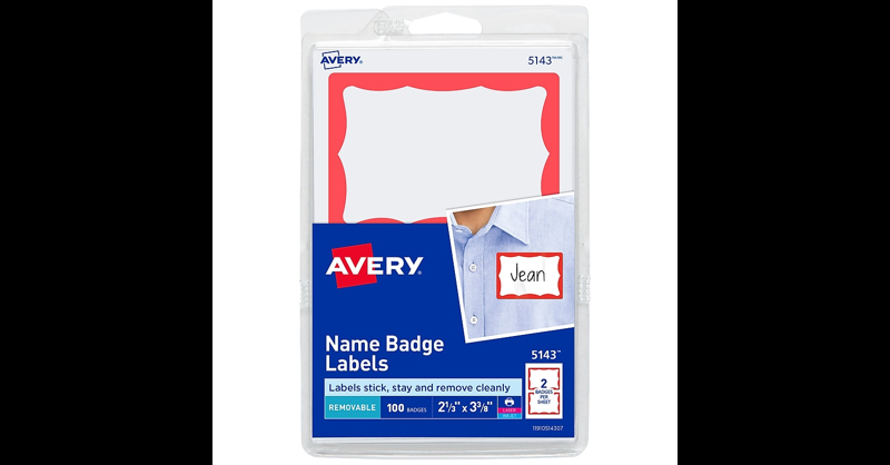 Create polished, professional-quality customized name tags with minimal time and effort using Avery adhesive name tags. These name tag labels have a stylish red border and use a removable adhesive that sticks securely to clothing but removes cleanly and easily when your event has ended. The name badge stickers firmly affix to most fabrics without curling, lifting or falling off, but are not recommended for use on delicate materials, including corduroy, plastic, leather, silk, suede, velvet or vinyl. Customized name badges are fantastic for business seminars, support groups, class reunions, bible study, office parties and other events. The printable rectangle labels also make great organization labels, gift tag labels, arts and craft stickers and more. Perfect for teachers, these personalized label stickers can be used as student name tags for classrooms, desk name tags, labeling supplies and more. Add that personal touch to your personalized custom name badge by hand or customize them easily using the free templates and designs on the Avery website, and print the 4" x 6" sheets on your laser or inkjet printer. Item comes with 100 blank name tags with red border. Quickly create custom name tag stickers by hand or print your custom stickers on the 4" x 6" sheets with your laser or inkjet printer. Easily create custom name tags using the free designs and templates on the Avery website. Great for use in the classroom, for volunteer work, on craft projects and labeling storage, these versatile rectangle labels let you personalize any event or situation. Keep your organization safer by creating temporary name badges on demand and adding 'screened', 'temperature tested' or other status indicators for anyone entering your site. Name badge labels stick firmly to most fabrics without curling or falling off, yet remove cleanly and easily. This pack of 100 Avery Self-Adhesive Name Badges lets you create polished, professional-quality name tags like a pro with minimal time and effort.