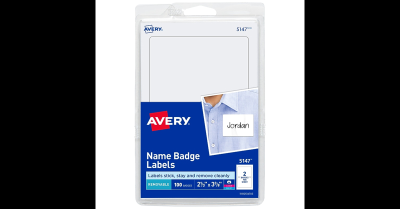 Create polished, professional-quality customized name tags with minimal time and effort using Avery adhesive name tags. These name tag labels use a removable adhesive that sticks securely to clothing but removes cleanly and easily when your event has ended. The name badge stickers firmly affix to most fabrics without curling, lifting or falling off, but are not recommended for use on delicate materials, including corduroy, plastic, leather, silk, suede, velvet or vinyl. Customized name badges are fantastic for business seminars, support groups, class reunions, bible study, office parties and other events. The printable rectangle labels also make great organization labels, gift tag labels, arts and craft stickers and more. Perfect for teachers, these personalized label stickers can be used as student name tags for classrooms, desk name tags, labeling supplies and more. Add that personal touch to your personalized custom name badge by hand or customize them easily using the free templates and designs on the Avery website, and print the 4" x 6" sheets on your laser or inkjet printer. Item comes with 100 blank name tags. Quickly create custom name tag stickers by hand or print your custom stickers on the 4" x 6" sheets with your laser or inkjet printer. Easily create custom name tags using the free designs and templates on the Avery website. Great for use in the classroom, for volunteer work, on craft projects and labeling storage, these versatile rectangle labels let you personalize any event or situation. Keep your organization safer by creating temporary name badges on demand and adding 'screened', 'temperature tested' or other status indicators for anyone entering your site. Name badge labels stick firmly to most fabrics without curling or falling off, yet remove cleanly and easily. This pack of 100 Avery Self-Adhesive Name Badges lets you create polished, professional-quality name tags like a pro with minimal time and effort.