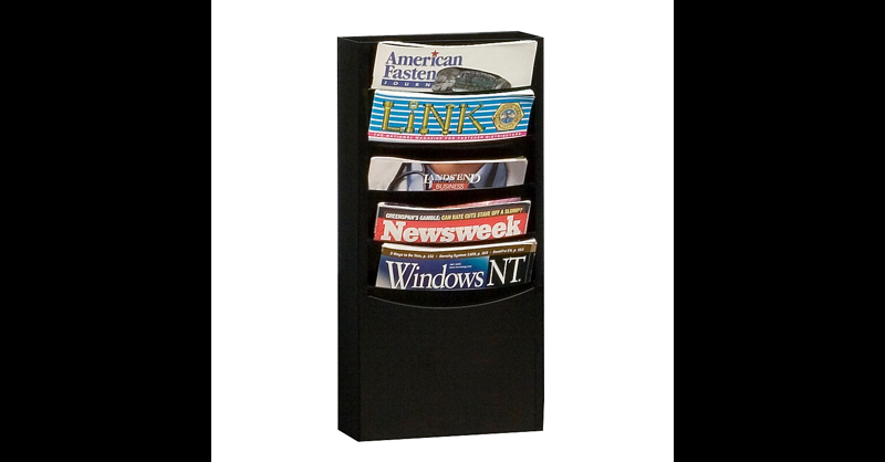 Durham Con-Tur Vertical literature rack color is made of prime, cold rolled steel with powder coat for added durability. Rack has 5 pockets for storing magazines and each pocket measures 8 1/2" x 8 13/16" x 3/4". 5 pockets. Size: 20 1/4"H x 9 3/4"W x 4 1/8"D. Color: black. Each pocket measures 8 1/2"H x 8 13/16"W x 3/4"D. Patented design eliminates paper curl. Made from prime, cold rolled steel. Durable powder coat. For 8-1/2" wide paper. 5 pockets; 3/4" pocket capacity. Size: 21Hx9-3/4"Wx4"D. Black. Racks can be hung from office partitions with chrome brackets (sold separately); optional stand-alone feet (#Q001879BK) available. ⚠ WARNING: Cancer and Reproductive Harm - www. P65Warnings. ca. gov. Durham Con-Tur Vertical literature rack color measuring 20 1/4" x 9 3/4" x 4 1/8" features patented design that eliminates paper curl and comes with 5 pockets to hold magazines and books.