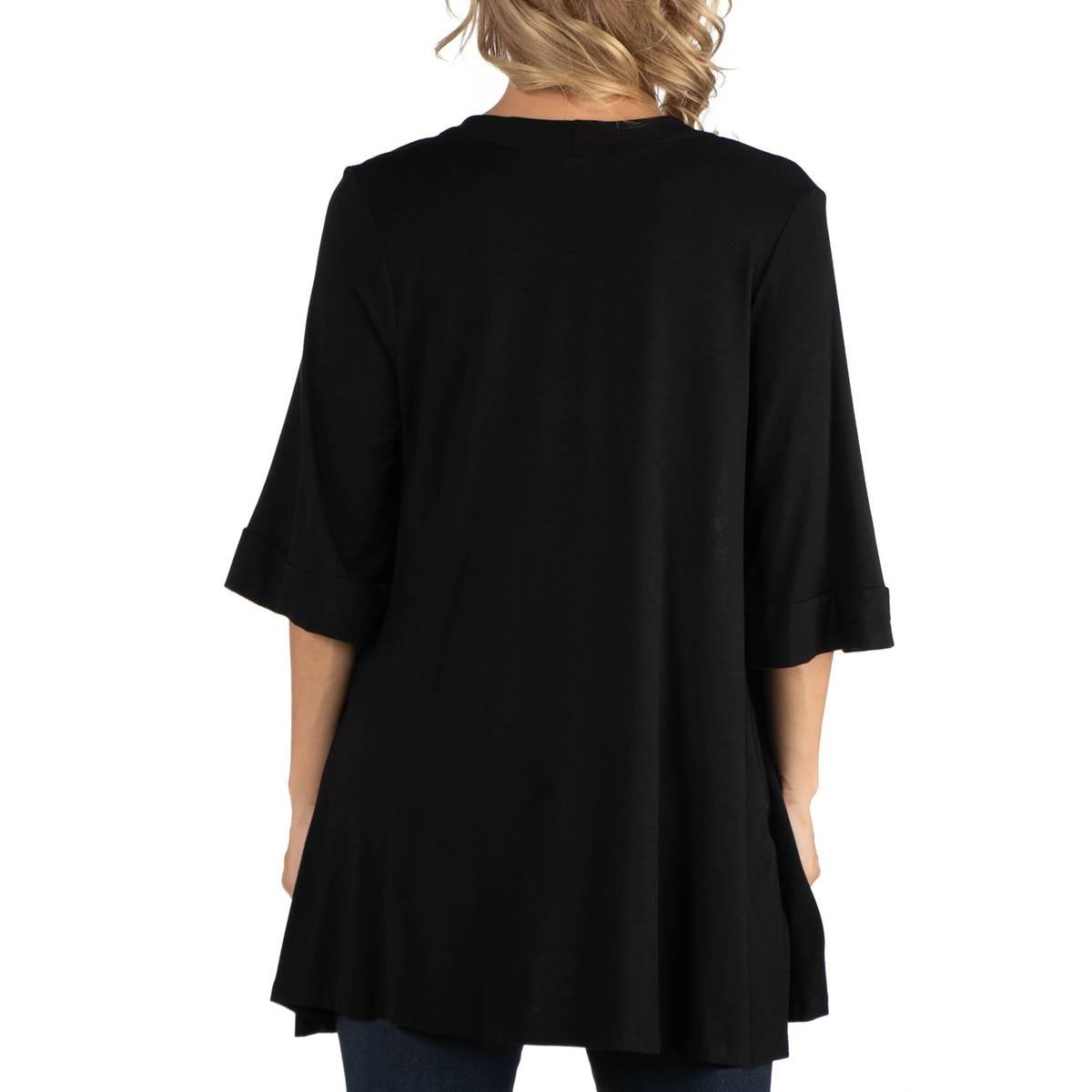 An easy add on to any look, this Plus Size 24/7 Comfort Apparel open front maternity cardigan is a great wardrobe staple. Featuring loose fit elbow-length sleeves, open front design, and extend length, and a comfortable relaxed fit. Simply throw this cardigan on over a t-shirt and jeans look for an added touch of style.