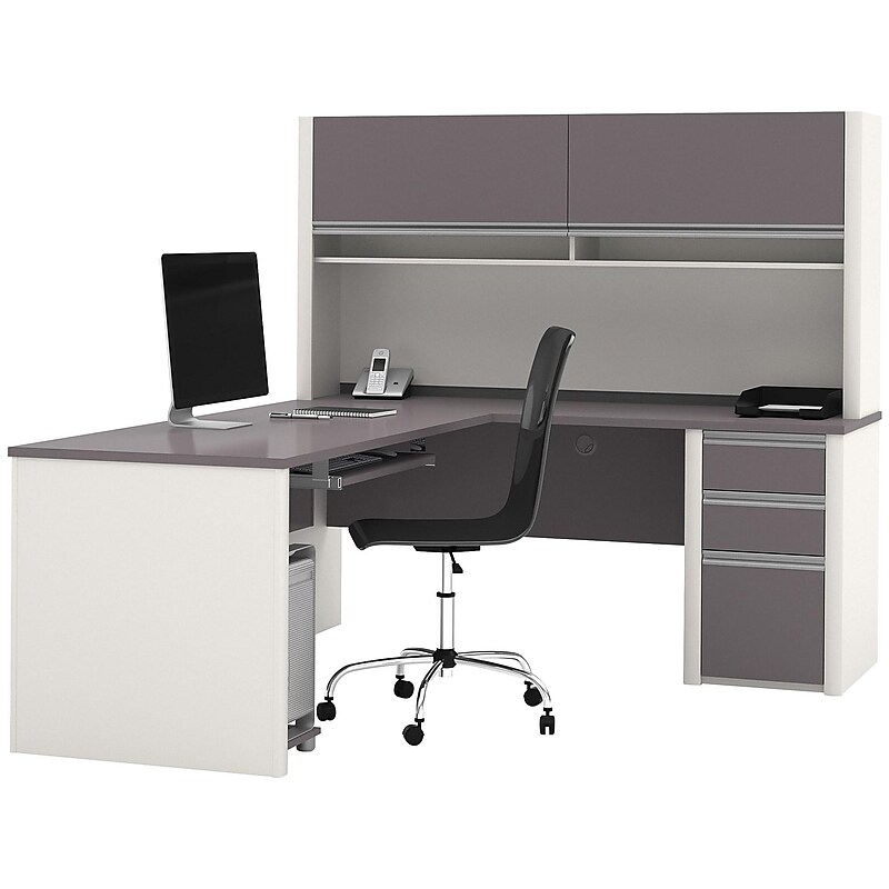 Upgrade your office with this L-shaped workstation. The attached hutch features two large concealed storage cabinets and two paper shelves, providing plenty of storage and organization options. A file drawer and two box drawers keep office supplies and important files within arm's reach, and an integrated cable management system keeps cords and wires neatly tucked away. This bestar Connexion L-shaped workstation features a melamine finish and impact-resistant PVC edge to withstand everyday wear and tear. An L-configuration desk adds ample work space to your office.sandstone finished work surface is made of a durable 1" commercial-grade PVC with melamine finish that resists scratches, stains, and wear. Dimensions: 65. 9"H x 71. 1"W x 82. 9"D. Clean contemporary styling designed with your needs in mind to provide years of practical solutions. Offers two utility drawers, keyboard drawer featuring double-extension slides for a smooth and quiet operation, and one file drawer. Features a file drawer with letter/legal filing system. Full assembly required, step-by-step manual provided. Meets or exceeds ANSI/BIFMA performance standards. Matching overhead hutch offers additional storage with 2 flip doors and paper management compartments. Includes roll-out keyboard shelf on ball-bearing slides and CPU stand. Doors are fitted with strong lift-up hardware. Grommets and a rubber strip are available on the station for efficient wire management. 10-year manufacturer limited warranty. ⚠ WARNING: This product can expose you to chemicals including formaldehyde, which is known to the State of California to cause cancer or birth defects or other reproductive harm. For more information, go to www. p65warnings. ca. gov/furniture. Give your private workspace added storage options with this bestar Connexion L-shaped workstation and a hutch.