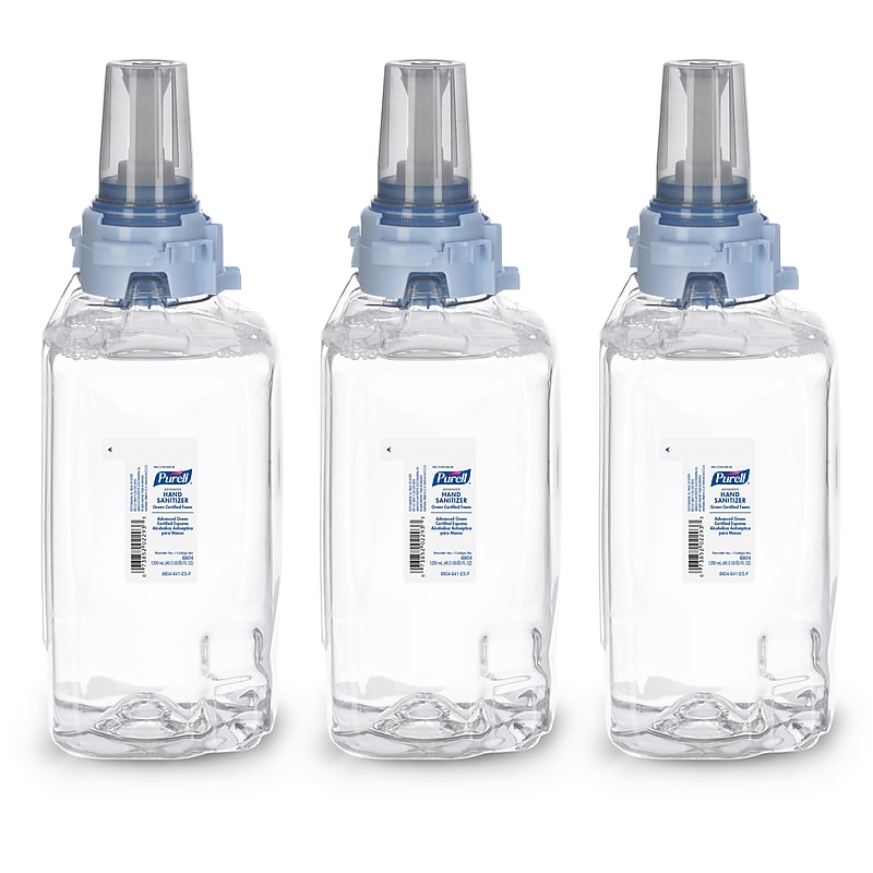 PURELL Advanced Green Certified Hand Sanitizer Foam, refill for ADX-12 dispenser, is a nonaerosol foam that contains 70 percent ethyl alcohol to help reduce the number of germs on hands. It meets the EcoLogo hand sanitizer standard UL 2783 for its use of bio-based raw materials, environmentally safer ingredients and packaging, and for enhanced recyclability compared to other products in its category. This sealed refill bottle for ADX-12 dispensers (sold separately) is made ofplastic to show the fill level and includes a fresh dispensing valve to help reduce potential germ exposure. The hand sanitizer includes four moisturizers to help keep skin hydrated. It is made with ethanol produced with renewable natural resources, and contains no fragrance or dye. Foaming Hand Sanitizer Refill for ADX-12 Dispenser. 3 per carton. mL. Fragrance-Free. Scientifically advanced, patent-pending foam formulation kills the most germs. Kills more than 99. 99 percent of most common germs that may cause illness. Ounce for ounce kills more germs than other national brands when used on hands in accordance to FDA Health Care Personnel Handwash test methodology. Milder on skin than hand washing, enhanced with a nourishing blend of four different skin-conditioners that are clinically proven to help maintain skin health. Made from naturally renewable ethanol to meet the EcoLogo hand sanitizer standard for environmental leadership. USDA Certified Biobased product. This product is manufactured by a certified WBE (women owned business). Safety Data Sheet . Show that you care about the well-being of people in your facility.
