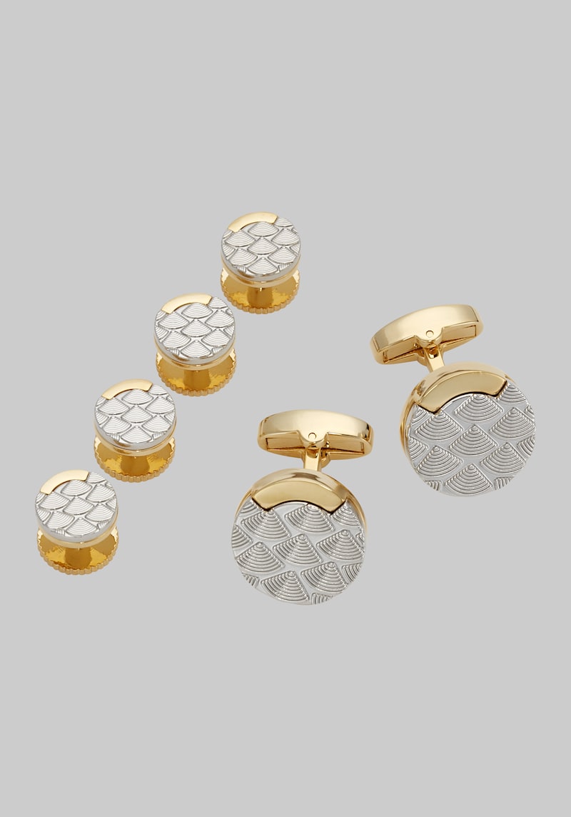 Elevate your attire with the timeless elegance of this silver- and gold-tone cufflink and stud set. The contrasting metals create a unique and eye-catching aesthetic, while the intricate etching adds a touch of dimension and personality. Perfect for a variety of occasions, this versatile set complements both classic and contemporary styles, ensuring you look sharp and polished no matter the setting. Jos. A. Bank Round Cufflink & Stud Set.