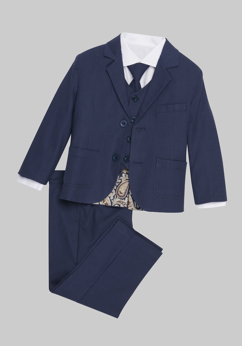 Ditch the tux hunt and dress your little man to impress with this handsome suit set. This all-in-one ensemble is the perfect solution for weddings, ring bearer duties, graduations, or any formal occasion where your little guy needs to look his absolute best. Effortlessly polished and put-together, this set ensures a look that will garner plenty of ooohs and aaaahs. Peanut Butter Collection Joey Safari Linen 5-Piece Set.