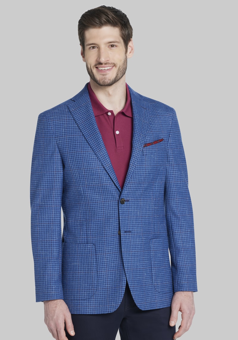 Fashioned from a rich wool blend woven with fine linen, this Jos. A. Bank sportcoat will let you create a wealth of smart-casual looks. Pairing a notch lapel with a two-button closure, this classic wardrobe staple is kept fresh with a flattering, Tailored Fit. Jos. A. Bank Tailored Fit Check Sportcoat - Big & Tall.
