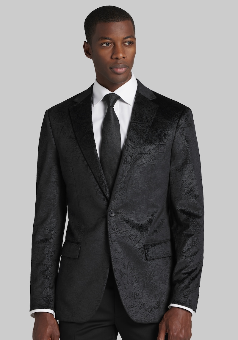 Make it an event to remember in the effortless elegance of this debonair embossed velvet paisley dinner jacket from Jos. A. Bank. Skip the tailor and head straight into your formal affair with this svelte, one-button jacket that allows you to select your jacket, vest, and pant sizes individually for an elegant look to remember. Jos. A. Bank Slim Fit Velvet Paisley Dinner Jacket.