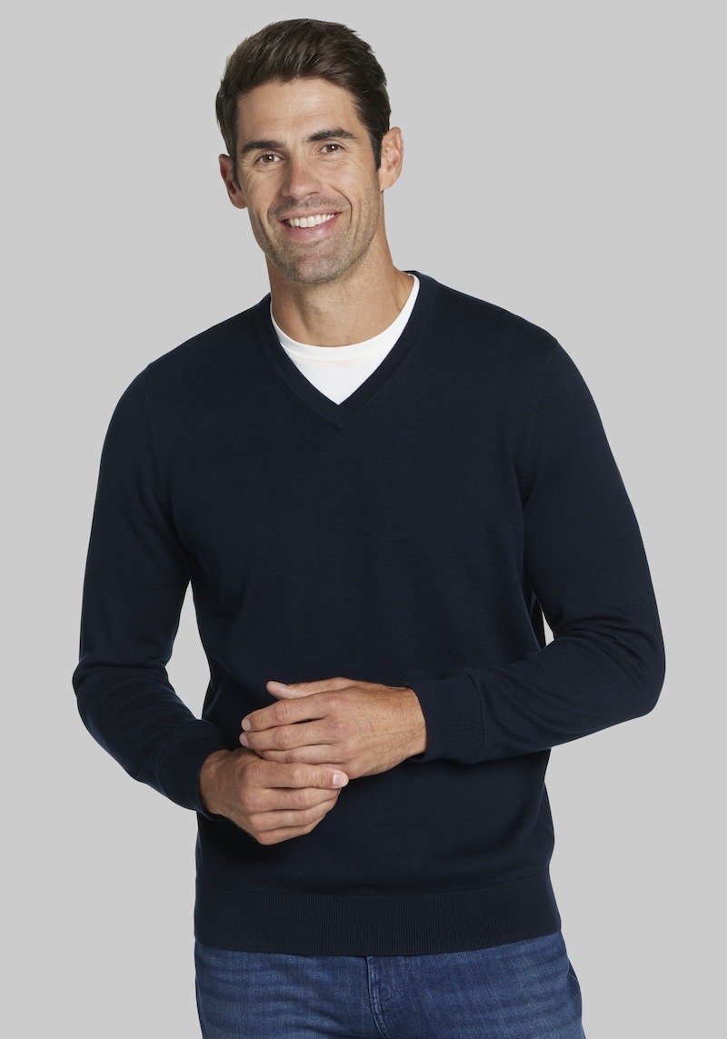 Luxuriate in everyday comfort with this V-neck sweater. Crafted from the finest Pima cotton, it offers an unparalleled level of softness that feels amazing against your skin. The classic V-neck adds a touch of timeless style, making it a versatile piece for layering or wearing on its own. Perfect for weekend relaxation or elevating your casual look, this sweater is your new go-to for effortless comfort. Jos. A Bank Pima Cotton V - neck Sweater - Big & Tall.