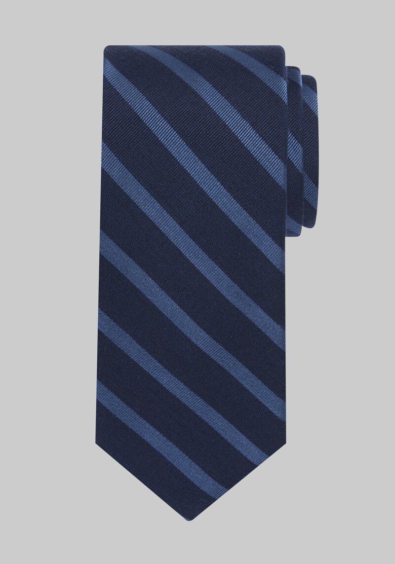 Channel classic preppy style with this repp stripe tie. This collegiate-inspired accessory boasts alternating thin and wide stripes. This tie is crafted from a luxurious blend with a hint of silk, ensuring both durability and a smooth feel that drapes beautifully. Its the perfect finishing touch to a crisp button-down shirt and chinos, or it can add a touch of polish to a casual sport coat. Jos. A. Bank Repp Stripe Tie.