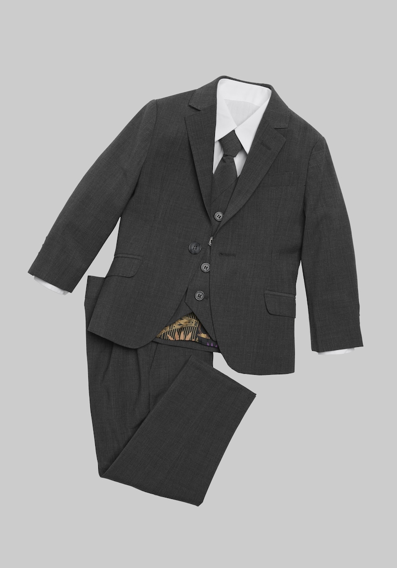 Dress your little gentleman in big guy style with this five-piece complete suit set. This stylish childrens suit is perfect for weddings, especially for ringbearers, and any other formal wear occasion. This handsome collection features a dress shirt, pre-tied tie, vest, coat, and slacks. Cleo By Peanut Butter Collection Slim Fit Luxor 5-Piece Suit Set.