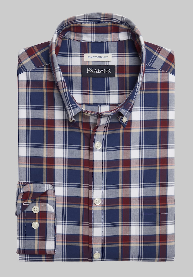 This sportshirt is all about effortless comfort and timeless appeal. Featuring a classic plaid pattern, it adds a touch of understated sophistication to your everyday look. Crafted from a comfortable cotton-blend fabric with a hint of stretch, it offers all-day comfort and allows for freedom of movement. The cotton blend ensures breathability, keeping you cool on warmer days, while the touch of stretch guarantees a flexible fit that flatters your physique. Perfect for weekend adventures, casual Fridays, or layering under a jacket, this versatile sportshirt lets you express your unique style. Jos. A. Bank Comfort Stretch Traditional Fit Long Sleeve Sportshirt - Big & Tall.